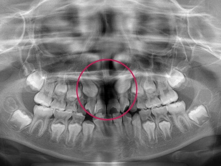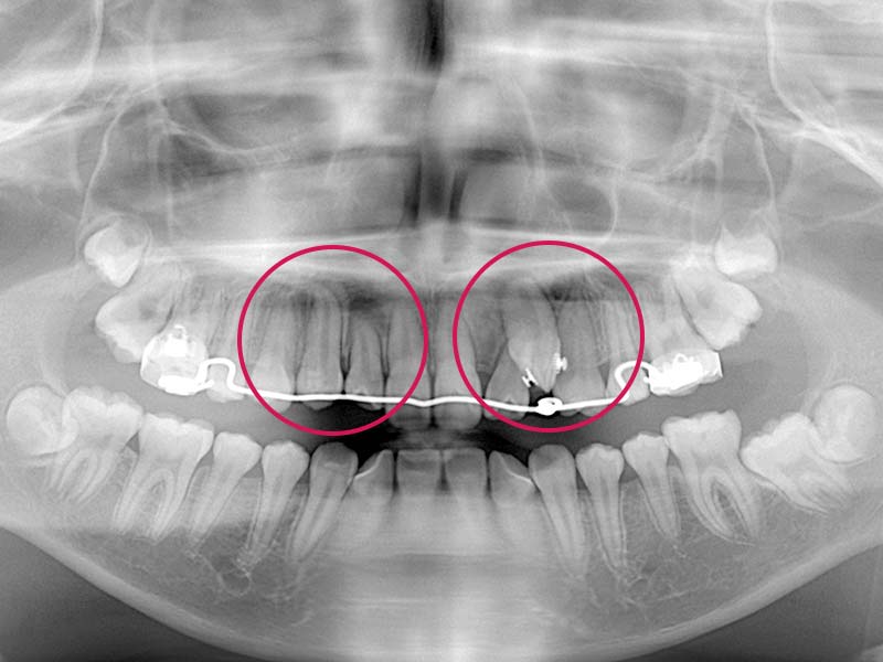 埋伏歯に多いのが、糸切り歯(犬歯)が生えてこないケースです。埋伏している犬歯の方向が、横を向いていることで、骨の中で他の歯の根っこと当たってしまっていることがあります。そのように歯に当たっていると、周りの歯の根っこが吸収して短くなってしまうことがあります。他の歯への影響が考えられる場合には、なるべく早く治療を行う必要があります。